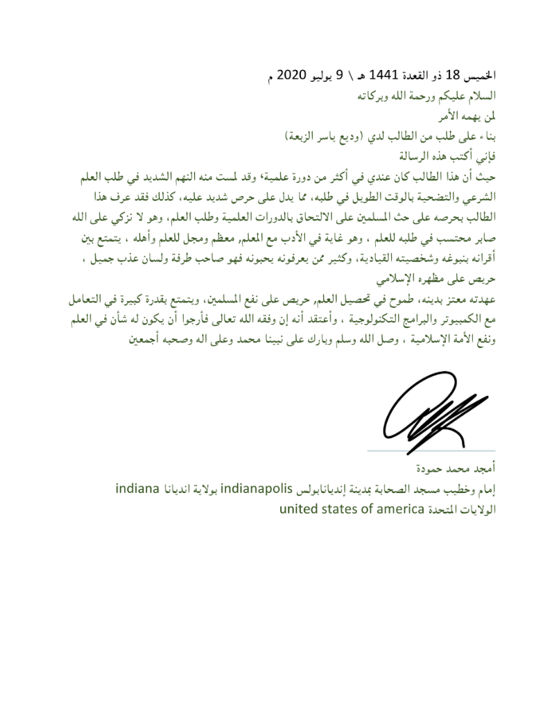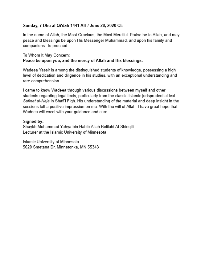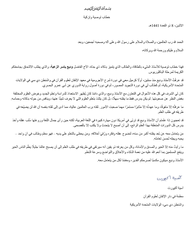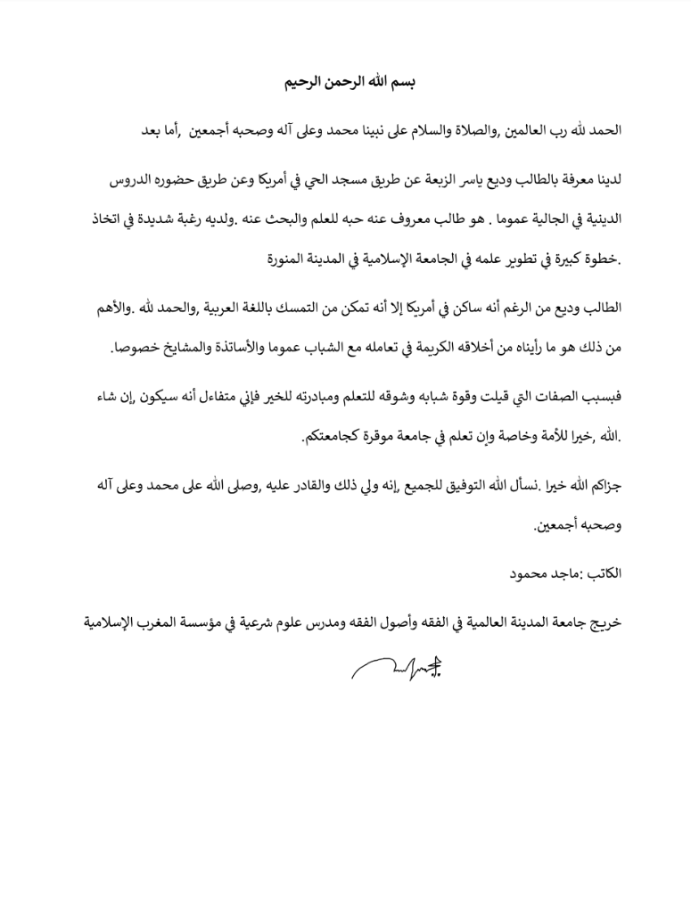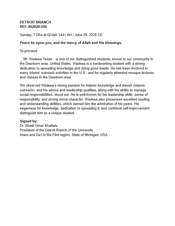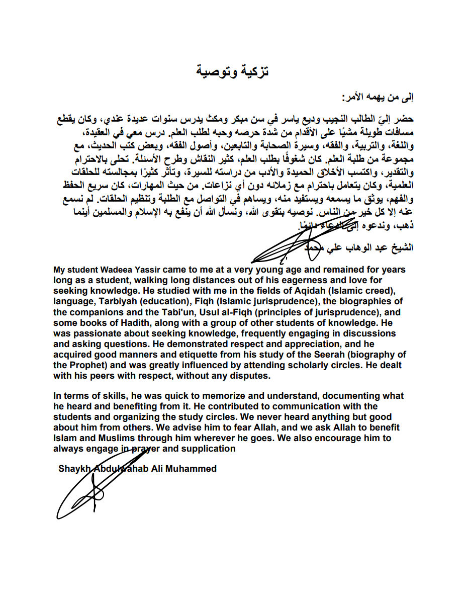 We, the undersigned, testify that our brother, Wadeea Yassir… is known for his integrity, good conduct, and polite manner, and he has been involved in some distinguished da’wah activities. We fully support his academic studies at your esteemed university, and we mention this with pride. We ask Allah the Almighty to grant him success in all his endeavors and help him achieve his goals, for He is the best to rely on.