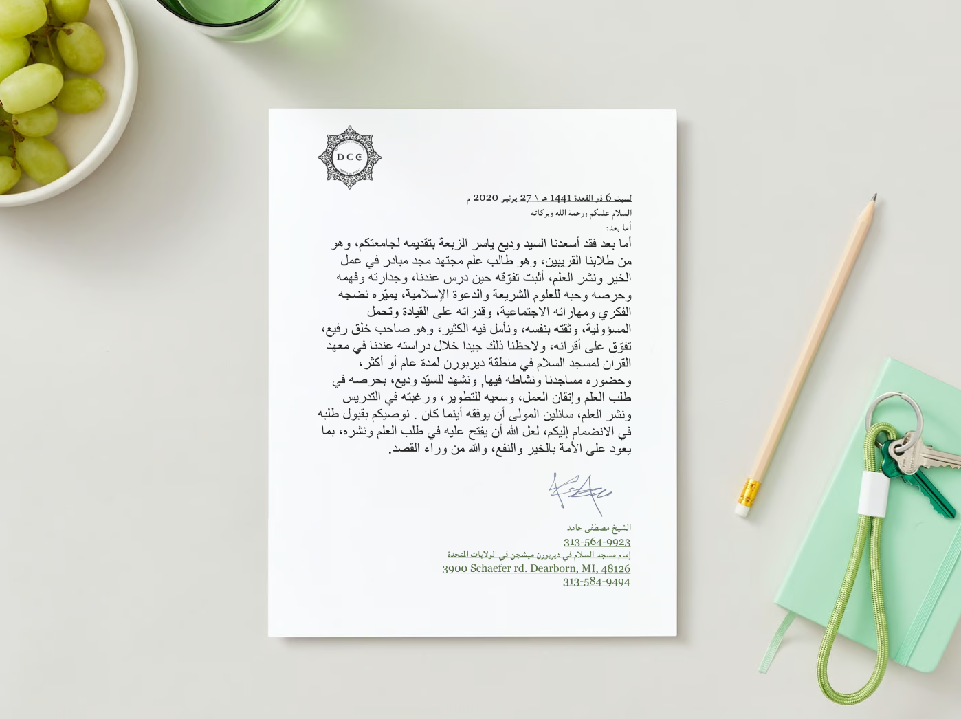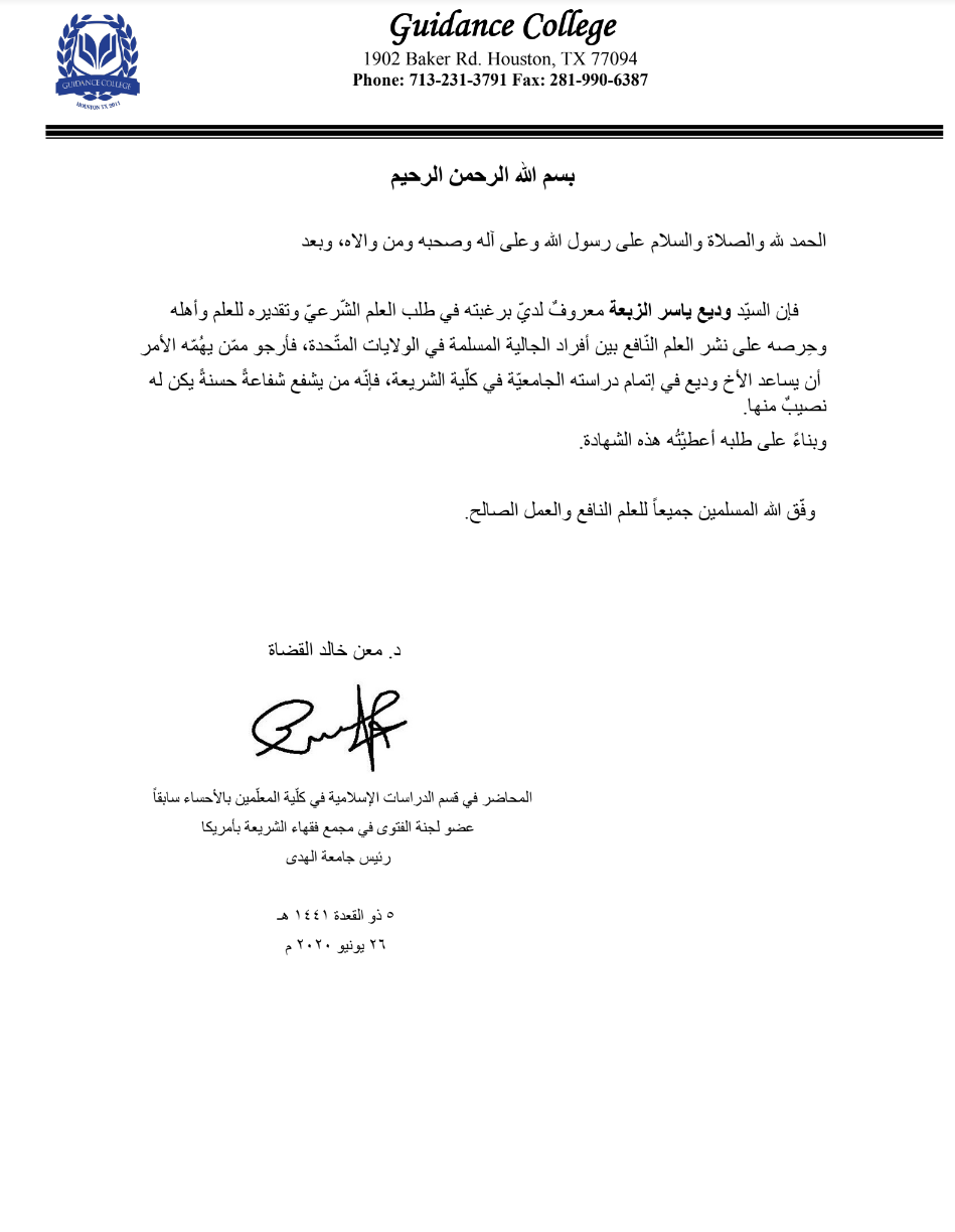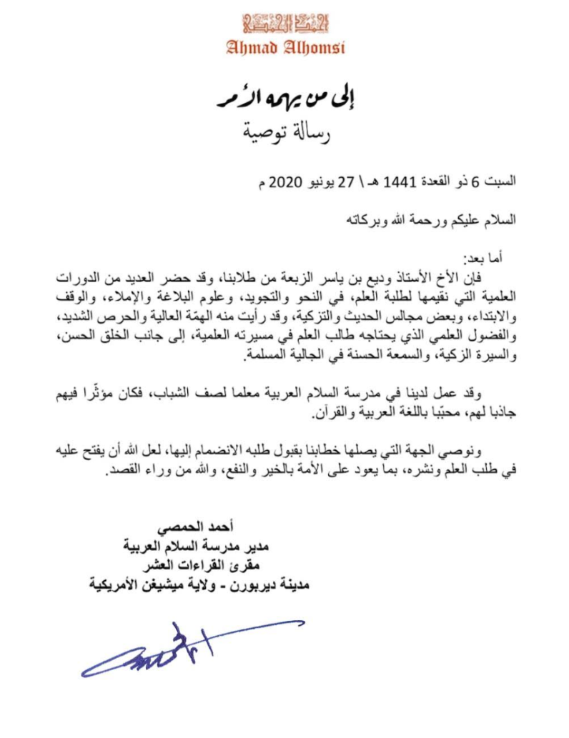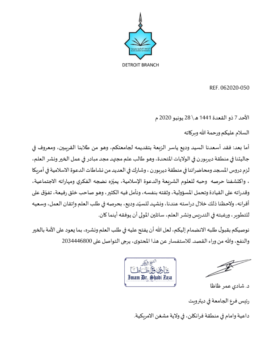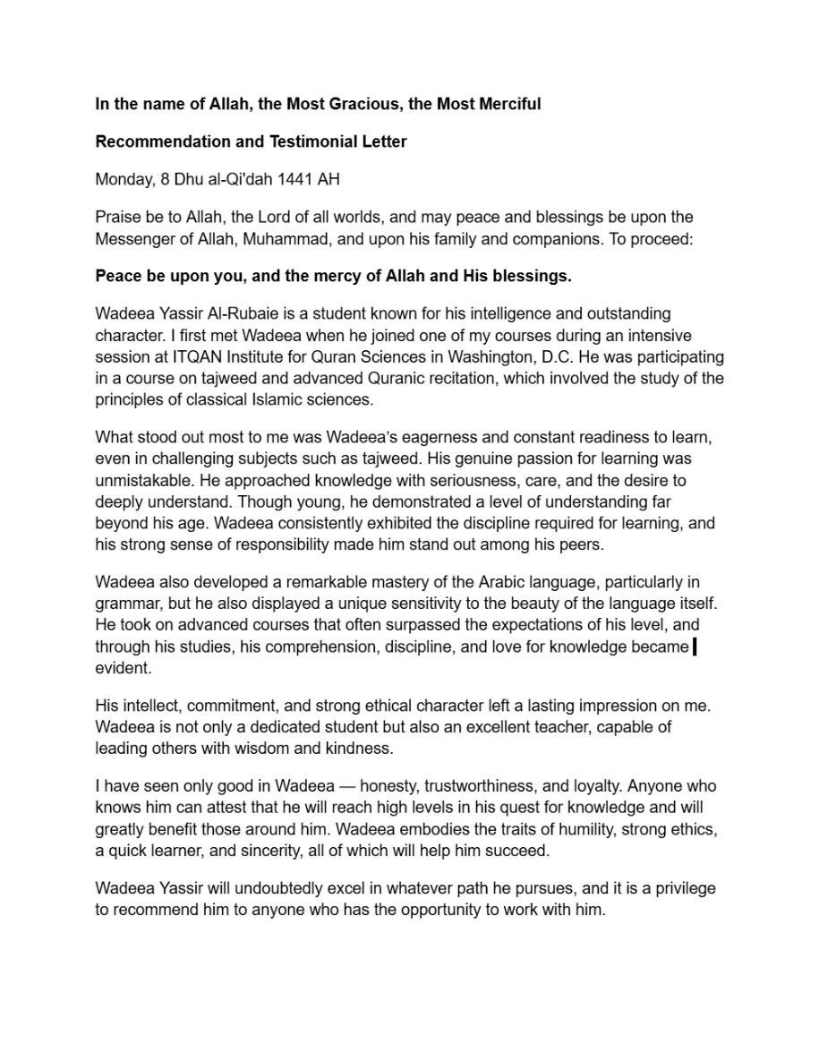 We, the undersigned, testify that our brother, Wadeea Yassir… is known for his integrity, good conduct, and polite manner, and he has been involved in some distinguished da’wah activities. We fully support his academic studies at your esteemed university, and we mention this with pride. We ask Allah the Almighty to grant him success in all his endeavors and help him achieve his goals, for He is the best to rely on.