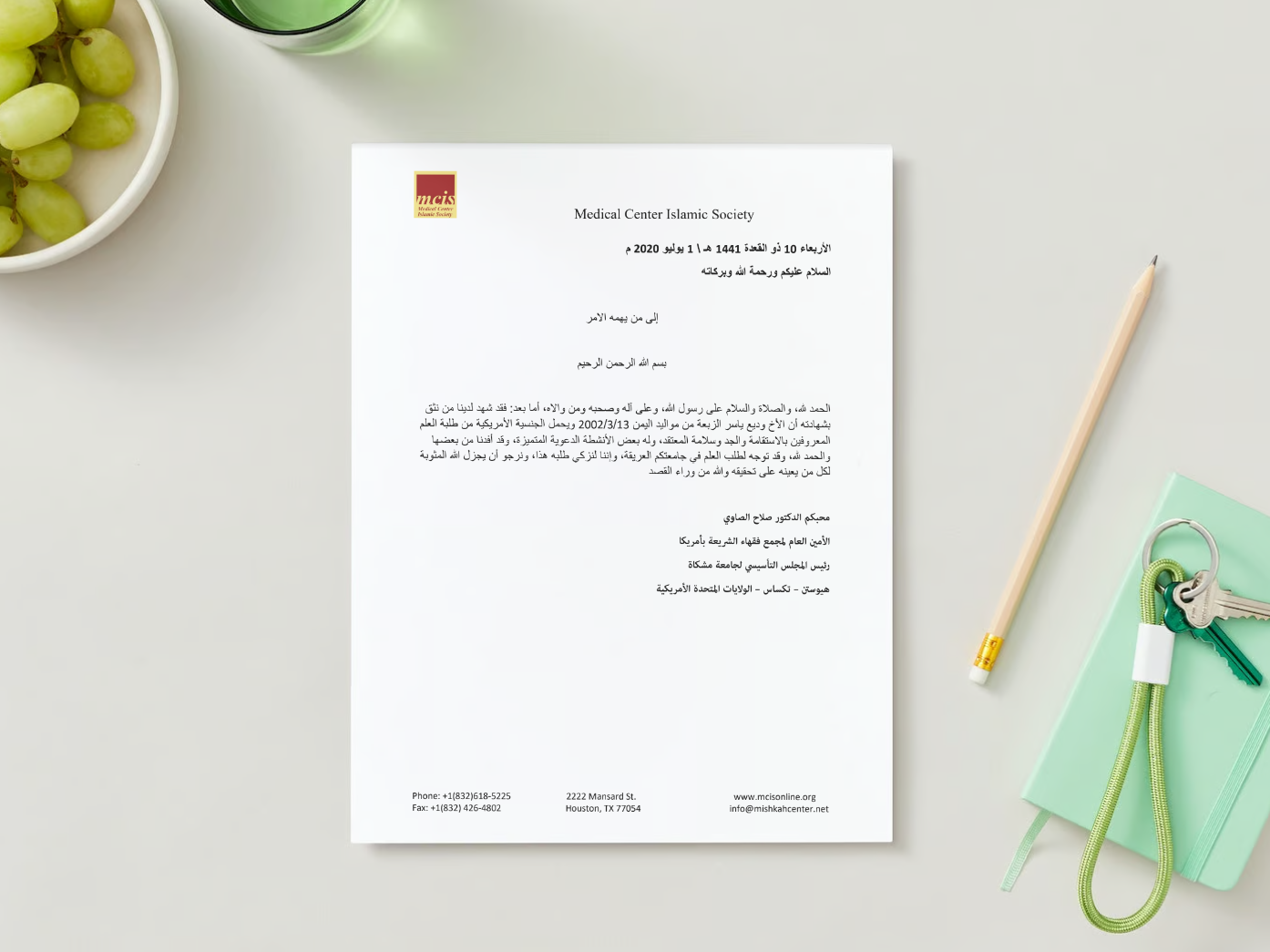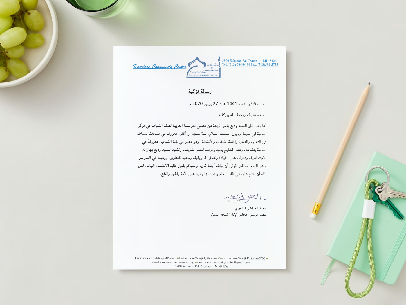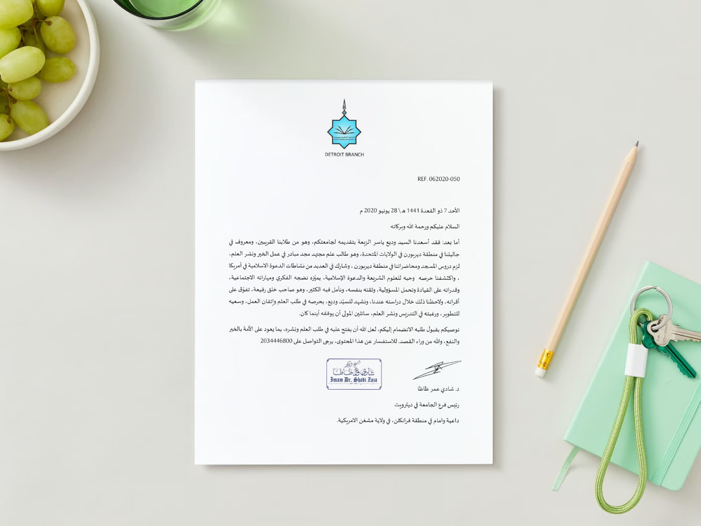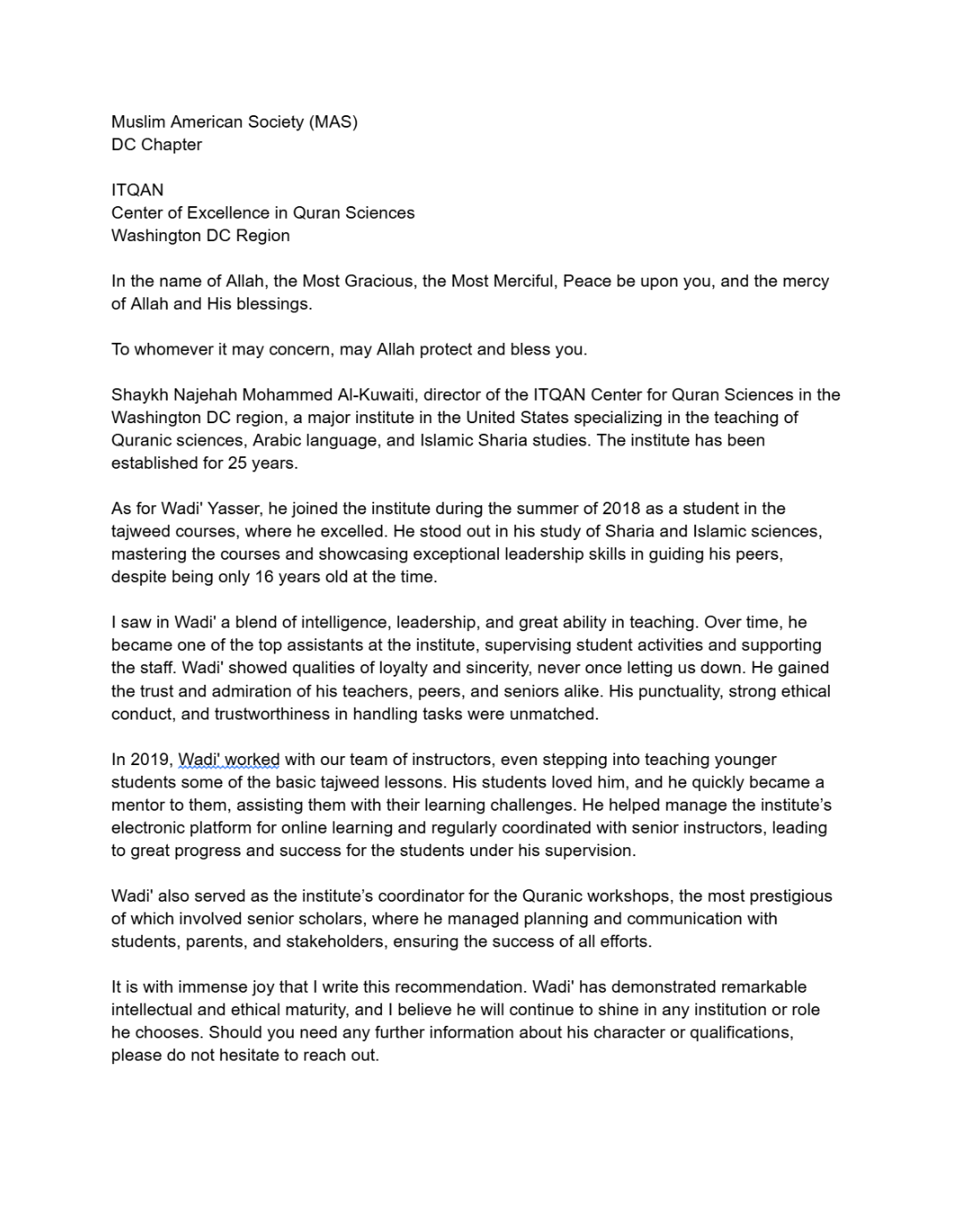 We, the undersigned, testify that our brother, Wadeea Yassir… is known for his integrity, good conduct, and polite manner, and he has been involved in some distinguished da’wah activities. We fully support his academic studies at your esteemed university, and we mention this with pride. We ask Allah the Almighty to grant him success in all his endeavors and help him achieve his goals, for He is the best to rely on.