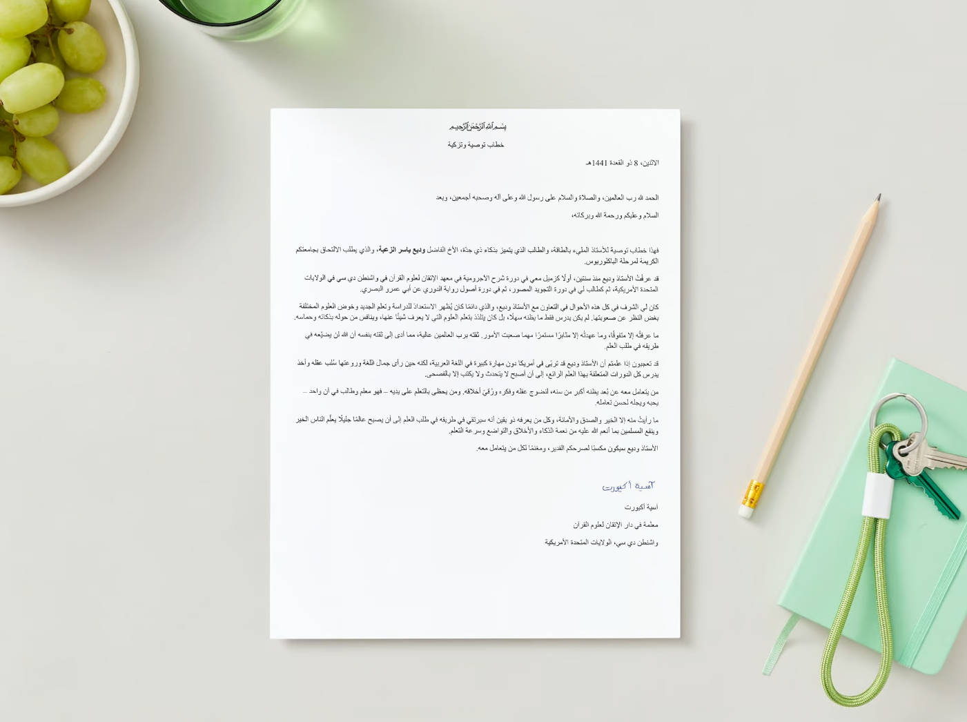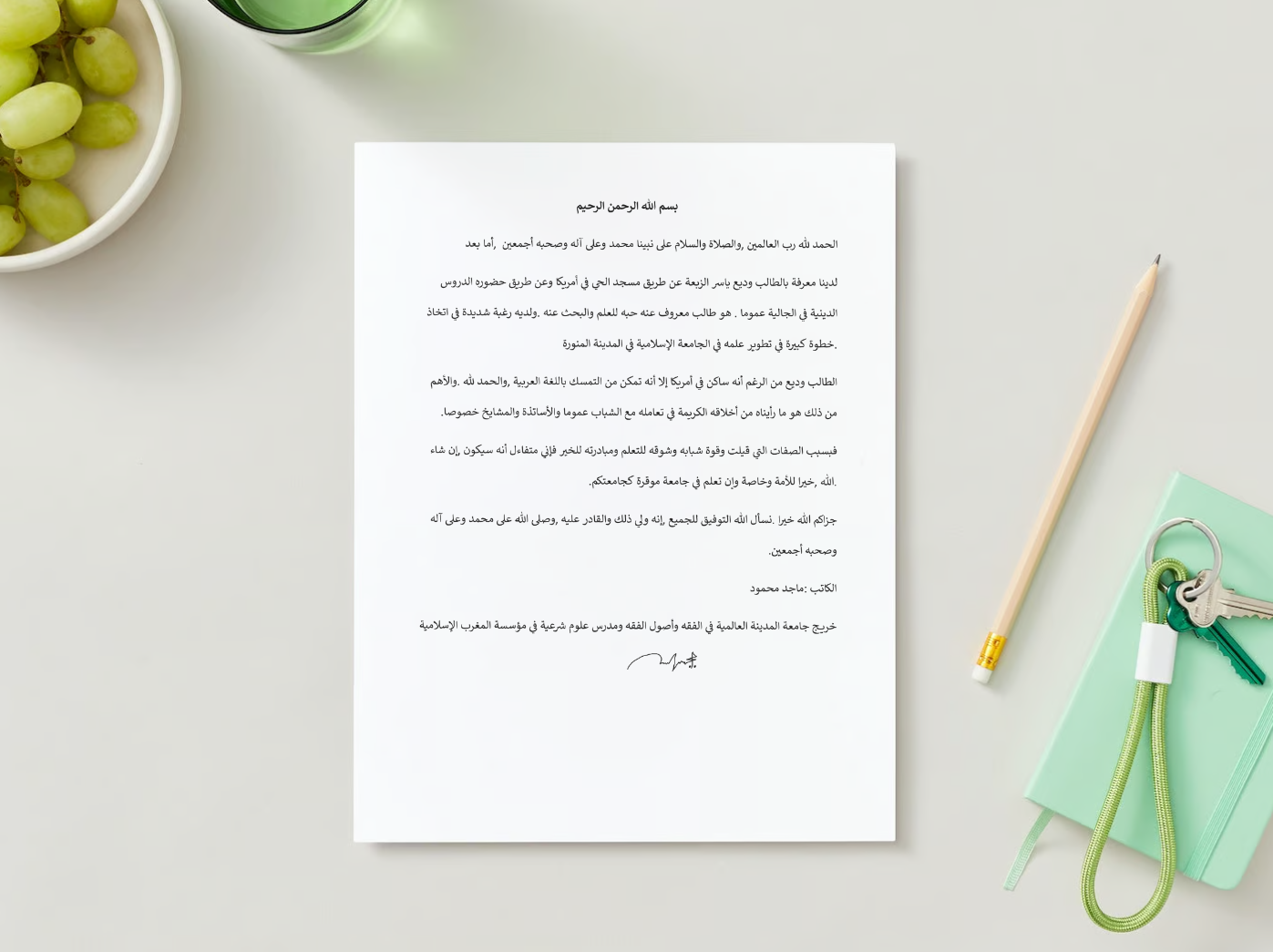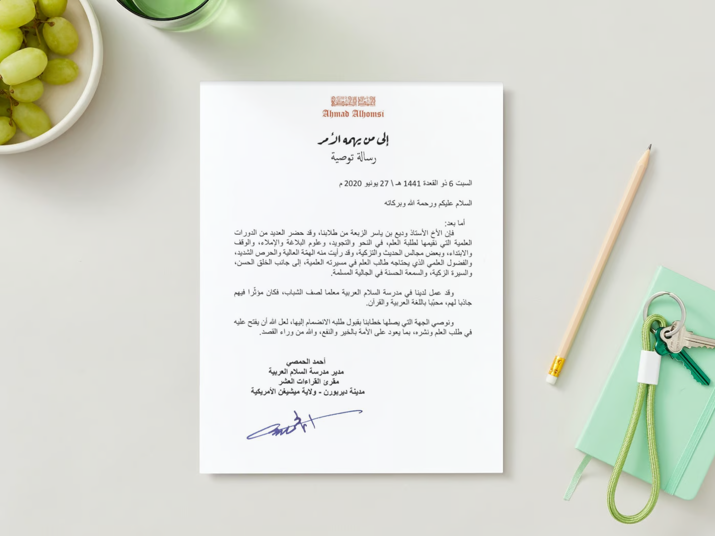 Therefore, I recommend him to everyone who meets him or works with him, confident that he is deserving of the opportunities he receives. He has a special zeal for work, diligence, and striving for perfection in his efforts to achieve his goals in any field he sets out to pursue. I ask Allah to bless him, increase him in goodness, and make him among His righteous servants, both in this world and the Hereafter.