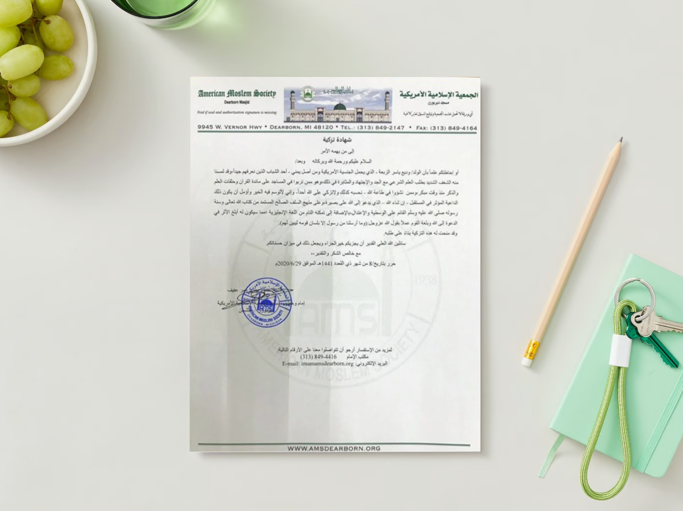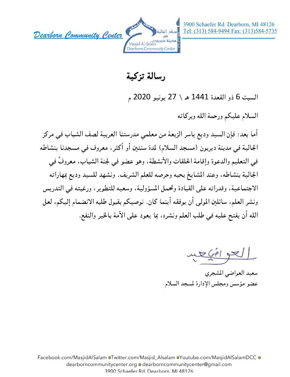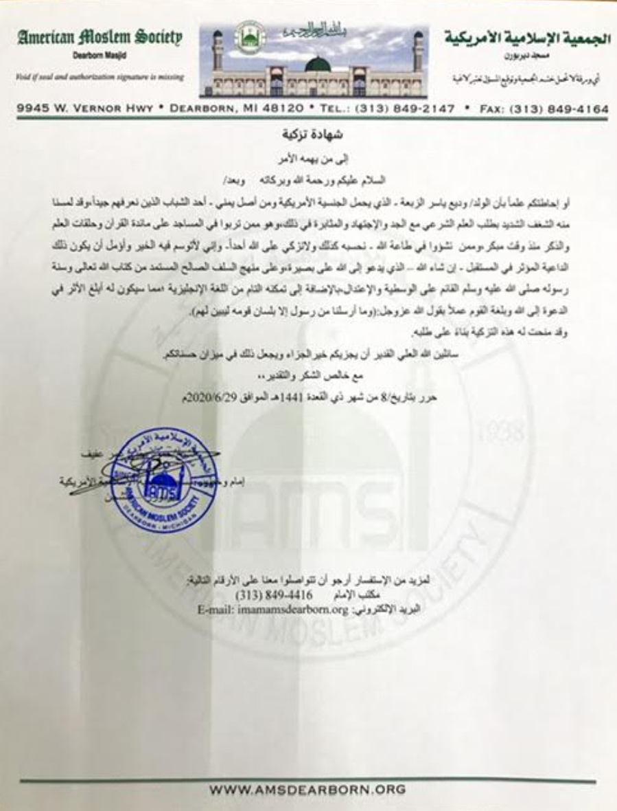 We, the administration of the American Moslem Society, testify that the brother Wadeea Yassir Al-Rubaie is among the well-mannered individuals who regularly attend our mosque. He has been committed to learning Islamic sciences, attending classes, and participating in dawah (Islamic outreach) activities in the mosque and the community. Wadeea has demonstrated a strong commitment to spreading knowledge and offering service to others, always motivated by a sincere desire to benefit the Muslim community. His commitment to learning and his adherence to Islamic principles are commendable, and he has earned the respect of both his peers and teachers. Wadeea has also participated in several community activities aimed at supporting the Muslim youth in our region. Based on his exceptional conduct and passion for acquiring and spreading beneficial knowledge, we fully recommend Wadeea Yassir for any academic or dawah-related endeavor. We ask Allah to grant him continued success in all his efforts.- Scholar: Shaykh Hamood Afif