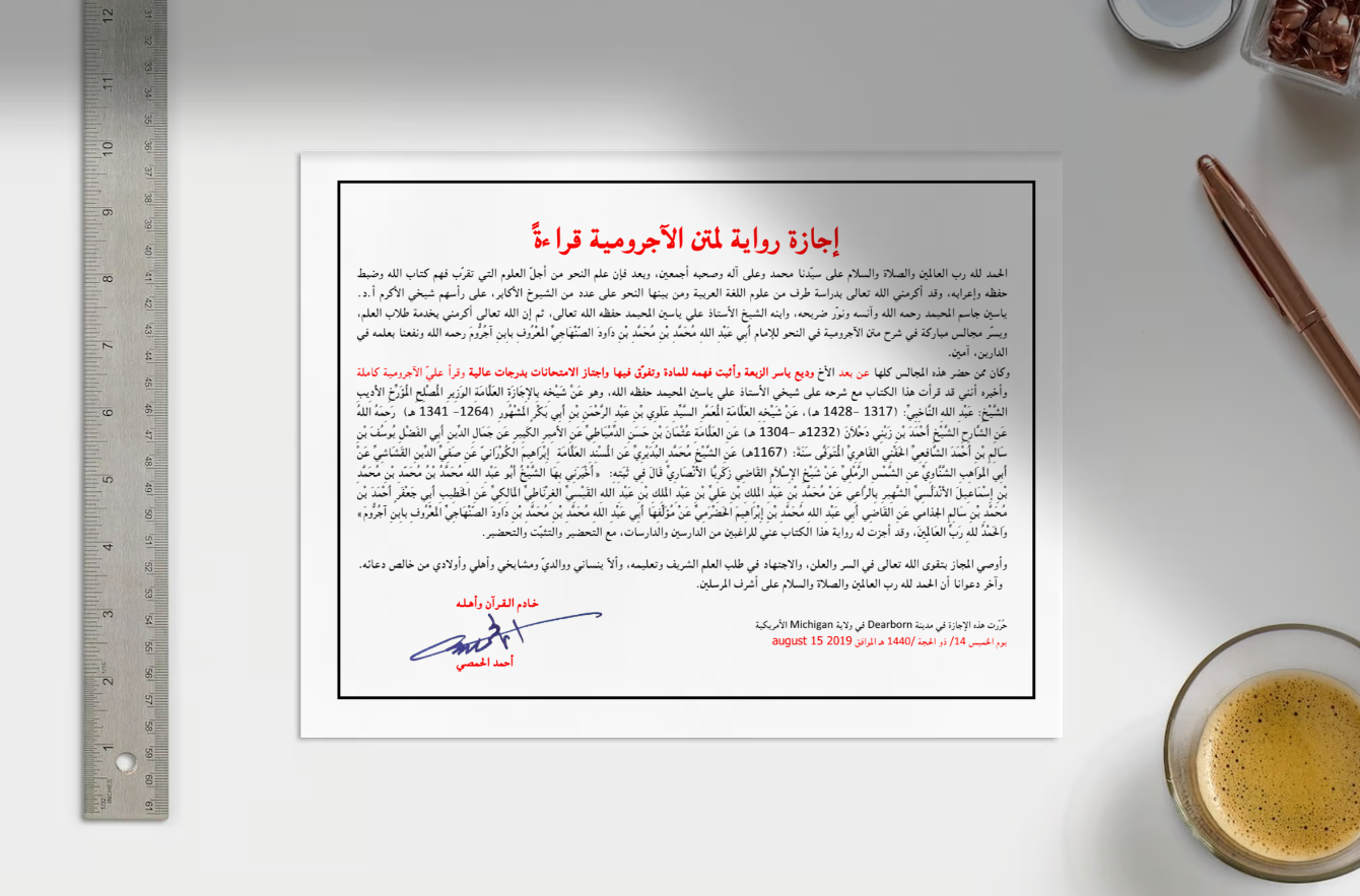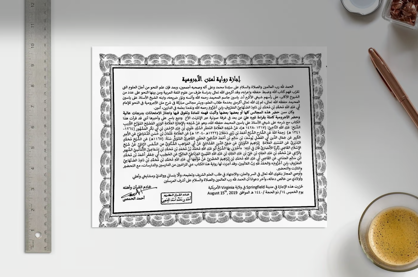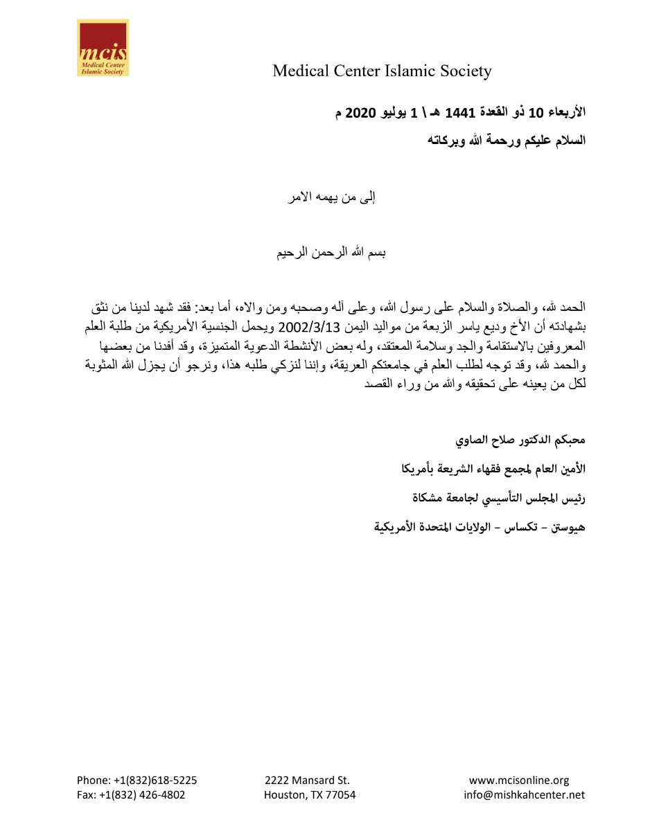 We, the administration of the American Moslem Society, testify that the brother Wadeea Yassir Al-Rubaie is among the well-mannered individuals who regularly attend our mosque. He has been committed to learning Islamic sciences, attending classes, and participating in dawah (Islamic outreach) activities in the mosque and the community. Wadeea has demonstrated a strong commitment to spreading knowledge and offering service to others, always motivated by a sincere desire to benefit the Muslim community. His commitment to learning and his adherence to Islamic principles are commendable, and he has earned the respect of both his peers and teachers. Wadeea has also participated in several community activities aimed at supporting the Muslim youth in our region. Based on his exceptional conduct and passion for acquiring and spreading beneficial knowledge, we fully recommend Wadeea Yassir for any academic or dawah-related endeavor. We ask Allah to grant him continued success in all his efforts.- Scholar: Shaykh Hamood Afif