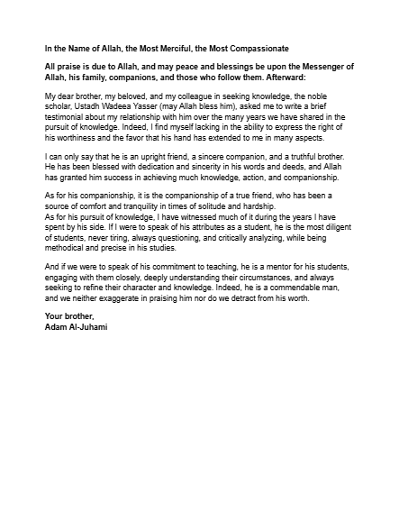 My student Wadeea Yassir came to me at a very young age and remained for years long as a student, walking long distances out of his eagerness and love for seeking knowledge. He studied with me in the fields of Aqidah (Islamic creed), language, Tarbiyah (education), Fiqh (Islamic jurisprudence), the biographies of the companions and the Tabi'un, Usul al-Fiqh (principles of jurisprudence), and some books of Hadith, along with a group of other students of knowledge. He was passionate about seeking knowledge, frequently engaging in discussions and asking questions. He demonstrated respect and appreciation, and he acquired good manners and etiquette from his study of the Seerah (biography of the Prophet) and was greatly influenced by attending scholarly circles. He dealt with his peers with respect, without any disputes.In terms of skills, he was quick to memorize and understand, documenting what he heard and benefiting from it. He contributed to communication with the students and organizing the study circles. We never heard anything but good about him from others. We advise him to fear Allah, and we ask Allah to benefit Islam and Muslims through him wherever he goes. We also encourage him to always engage in prayer and supplication.